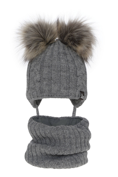Ensemble d'hiver fille: bonnet et snood, gris, avec deux pompons, wiązany Marlen